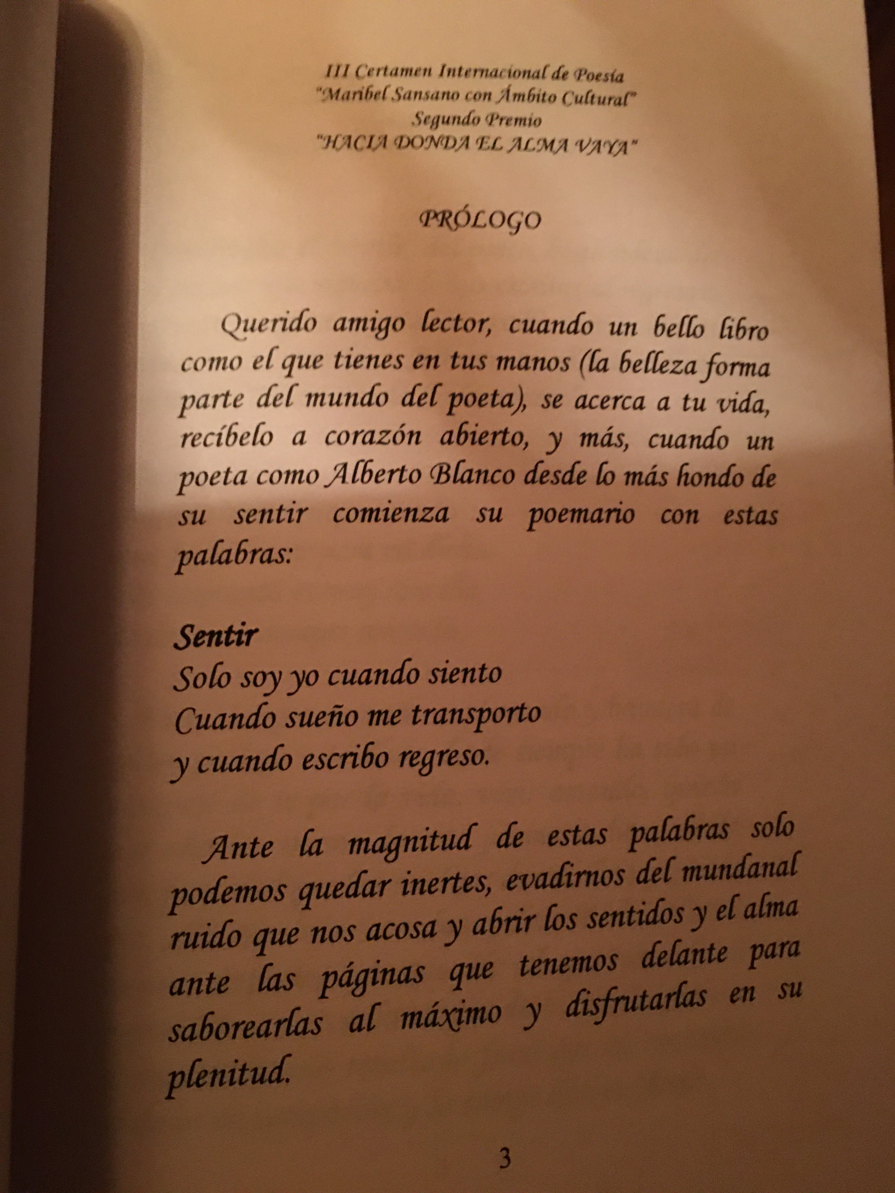 Vivir siempre amando es el escudo y bandera de quien prologa este libro, desde siempre ha sido mi equipaje de ir por la vida, vivir amando, quizás por ello los versos de este poemario han calado con facilidad por las rendijas de mi alma y quizás por ello también con las palabras de Alberto siento empatía, ya que él, al pensar así, al expresarse así, con la magia de la poesía obtiene el extraordinario resultado final que es, convertir el dolor en compasión y la compasión en Amor.