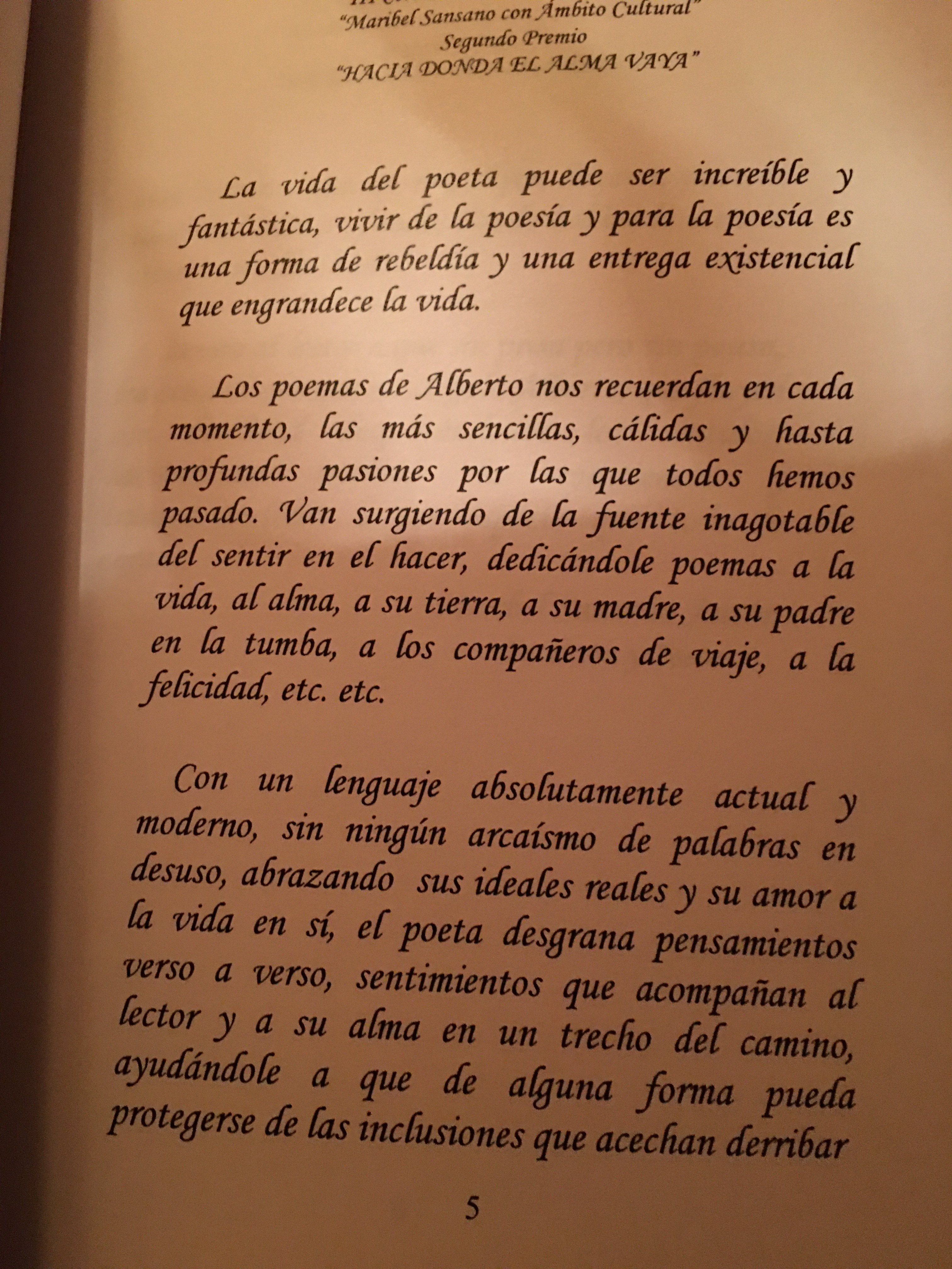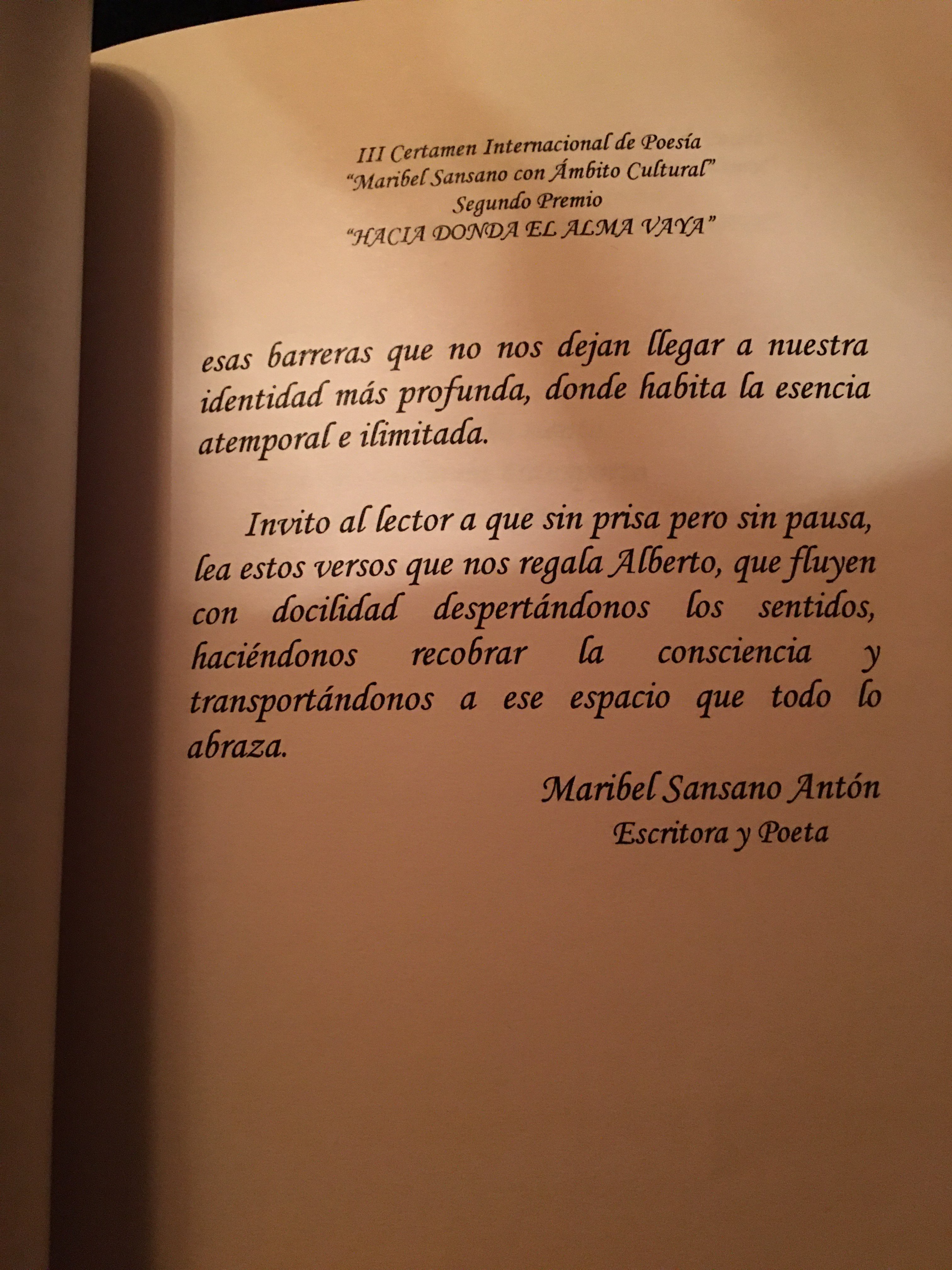 Contemplar el «sentir del poeta, la grandeza de sus sueños y la riqueza de sus escritos al regresar, es tener la gran suerte de recibir ese guiño al corazón que nos hace Alberto en el maravilloso poemario “Hacia donde el alma vaya”.
